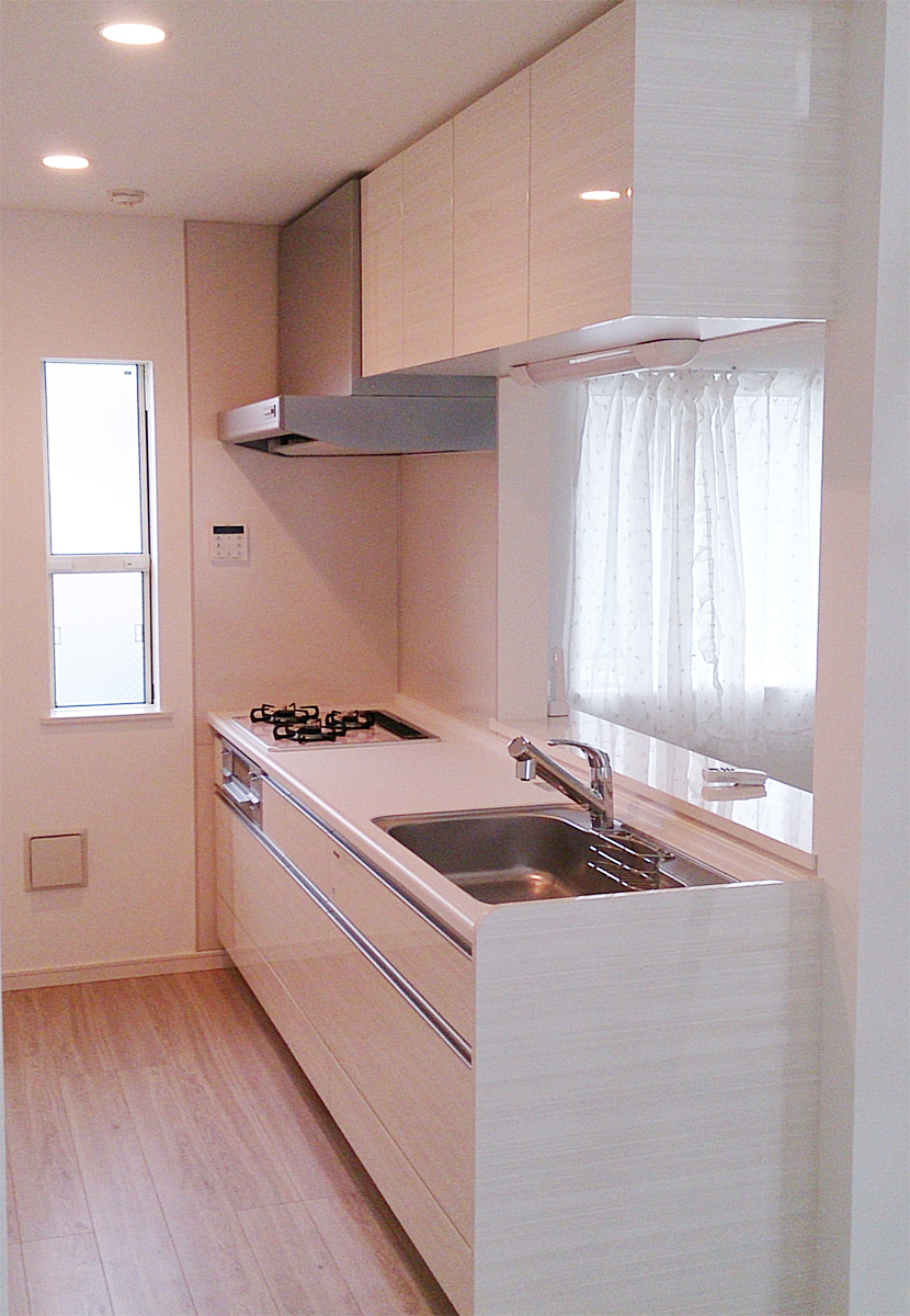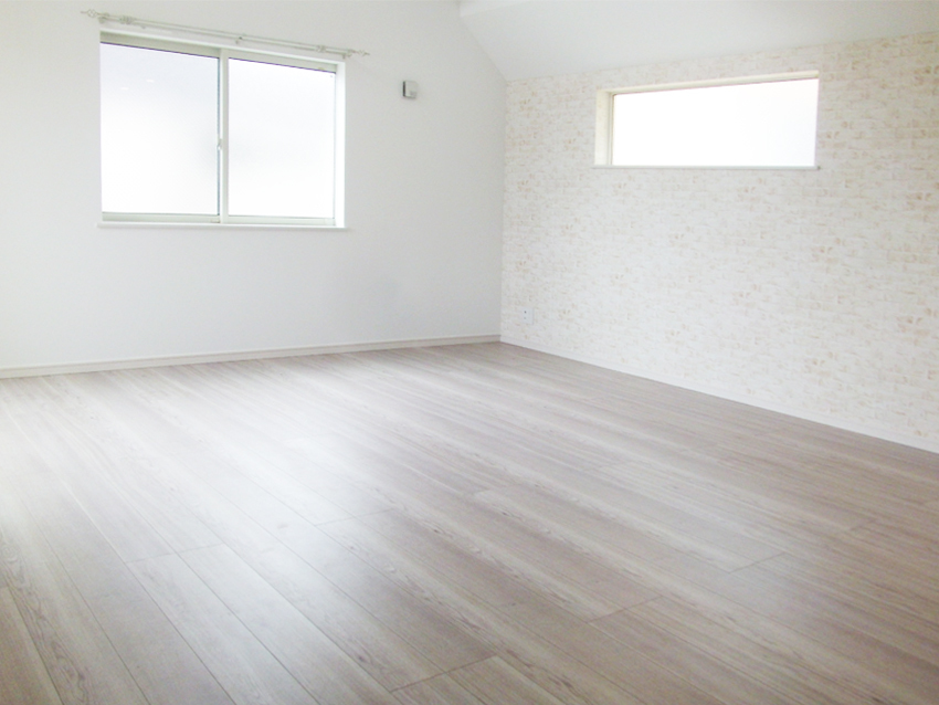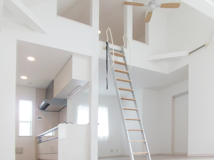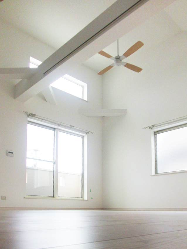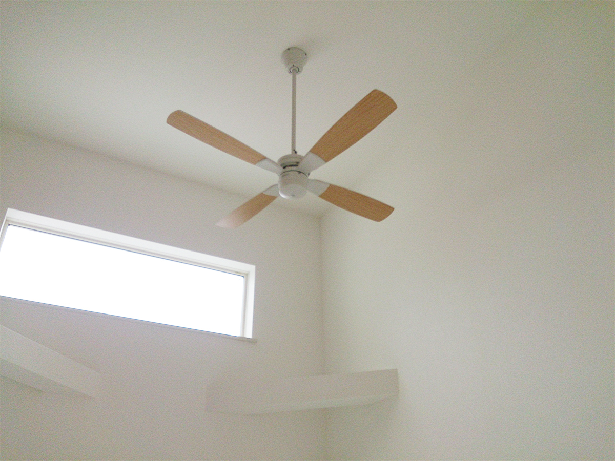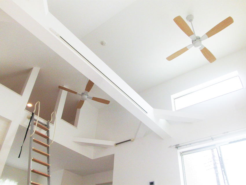天井吹き抜けのLDKを、レンガ調のタイルとシーリングファンがより一層おしゃれに、そして大空間に演出してくれます。